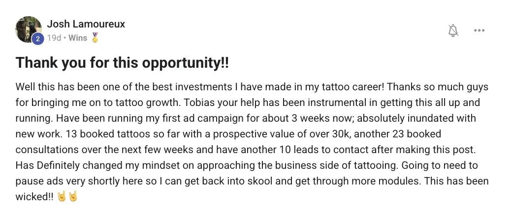 “I’ve been tattooing for over 15 years, but behind the scenes? It felt messy. Leads fell through, bookings were scattered, and I was juggling everything alone. Tattoo Growth changed that. One £120 ad brought in over £2.3k — but more importantly, I had a real system. The automations did the heavy lifting, and I could finally focus on the art. This isn’t fluff — it’s structure, tools, and a community that gets it.”