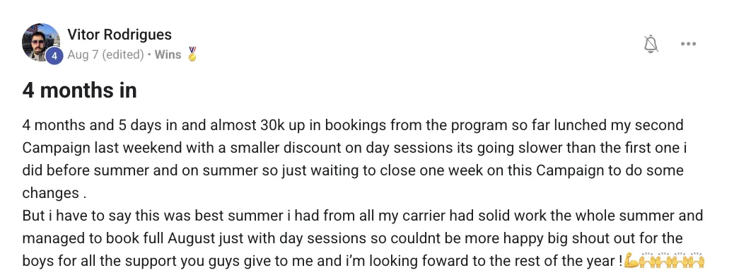 “I was spending €500–600 a month on boosted posts with barely any results. Now I spend half and get way more. I’m fully booked on guest spots across Europe — Hamburg, Frankfurt, Italy. The value in this program is insane.”