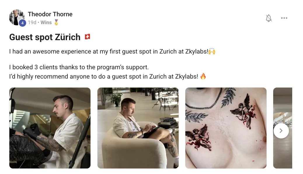 "I have been in Tattoo Growth for 3 months and I literally went from 2 weeks in advance, scraping what I could get and booked in whatever project I could - to being booked 4 months ahead with large projects that I want to do. The marketing and the sales I learned has been a true game changer for me." - @mr.calle - Tattoo Artist in Denmark